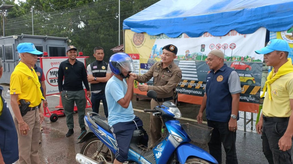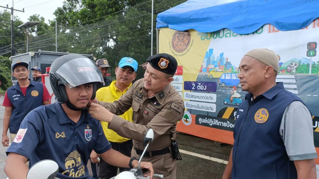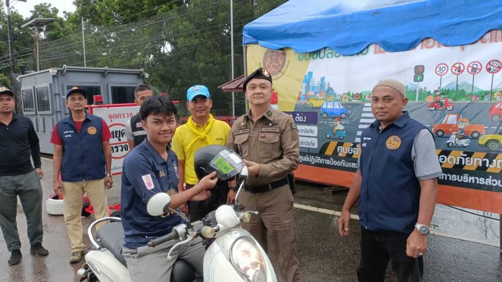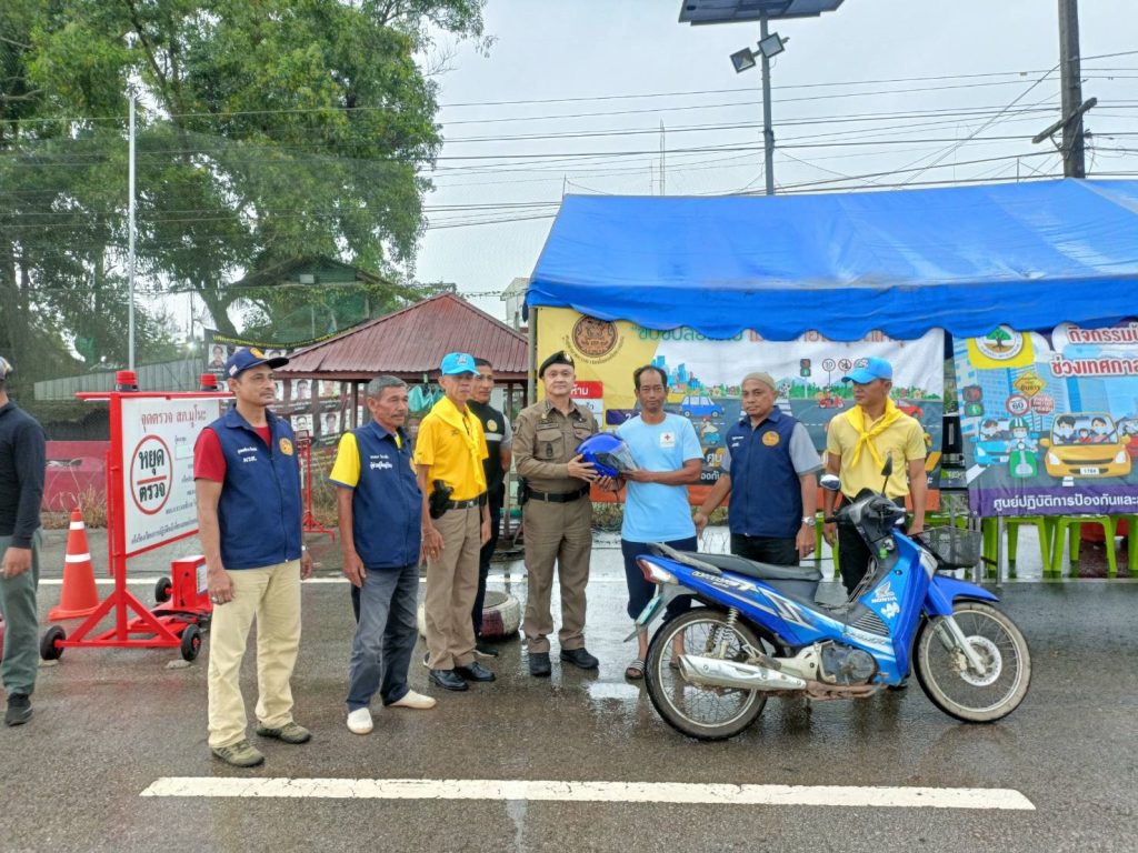 ให้กับพี่น้องประชาชนที่ขับขี่รถจักรยานยนต์โดยไม่สวมหมวกนิรภัย ทั้งนี้ได้มีการอบรมให้ความรู้เกี่ยวกับกฎหมายจราจรและประโยชน์ของการสวมหมวกนิรภัยขณะขับขี่